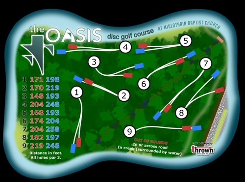 The Oasis is a beautiful wooded 9 - hole disc golf course. Despite being only 9 holes there are several different layouts that will challenge players of all ages and skill levels. The course is open dawn to dusk Monday through Saturday and Sunday 1 PM to dusk. We hope that you will come and play our course, and enjoy God's creation while playing.