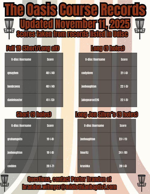 Pastor Brandon, our Family Pastor, would love to play a round of disc golf with you. If you would like to play, you can click the link below and he will reach out to get a round in.